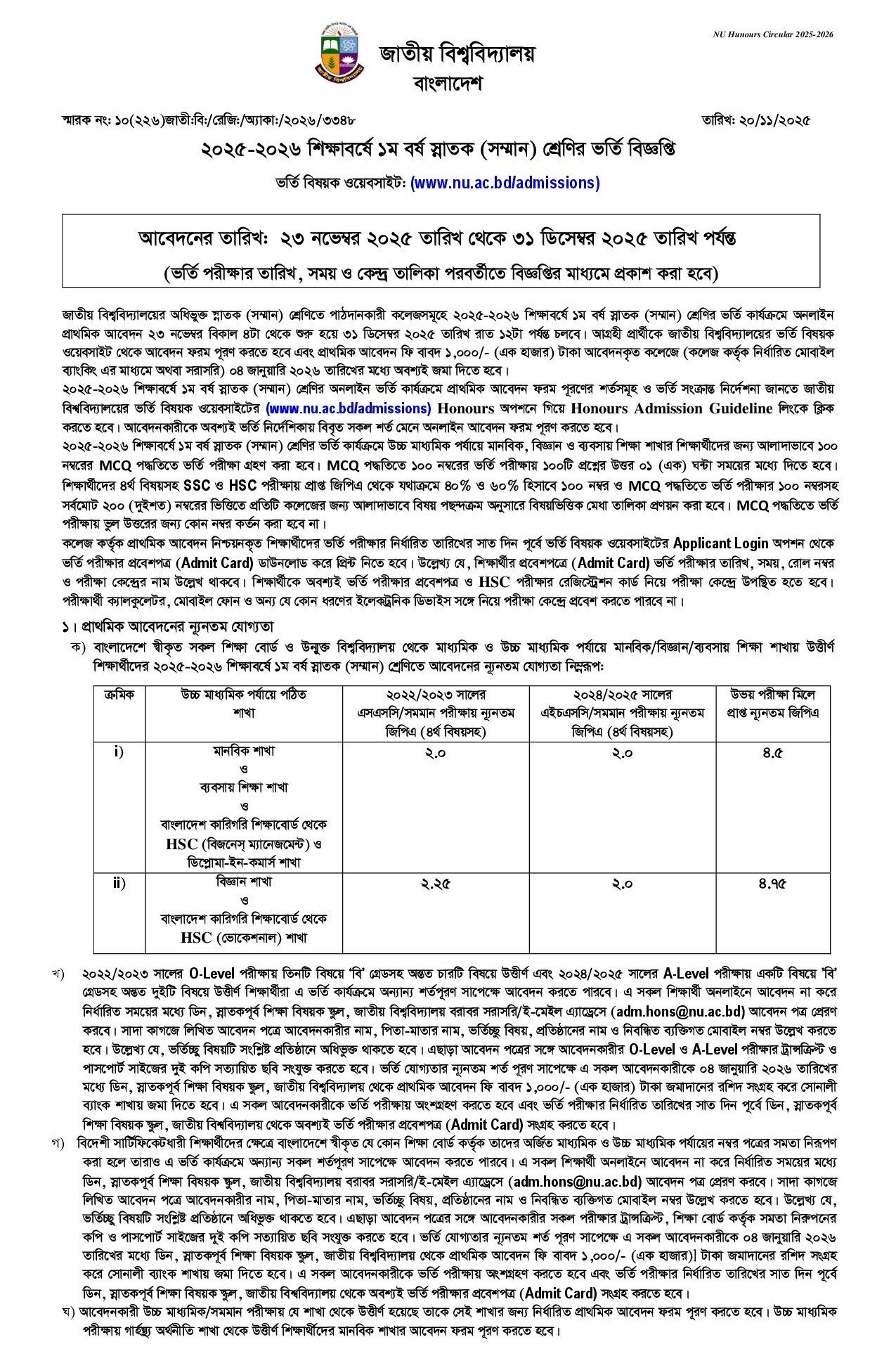 The National University published the official NU Admission Circular 2026. This circular is for Honours 1st Year. It came out on 20 November 2025. It officially covers the 2025-2026 academic session.